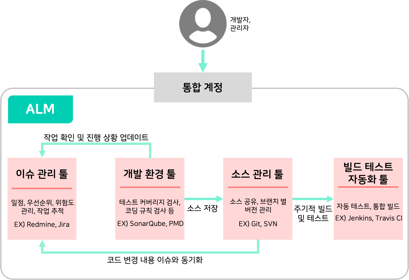 ALM이란, Application LifeCycle Management의 줄임말으로, 애플리케이션을 구상하기부터 수명 종료까지의 전 과정에서 사용되는 툴이나 프로세스를 관리하기 위한 접근 방법입니다. 한 마디로 개발 전반의 과정을 가시화할 수 있는 솔루션이라는 것이죠. 개발의 각 과정에서 사용되는 전문화된 도구들을 서로 유기적으로 연동하여 각 과정간의 괴리가 없도록 도와주는 역할을 합니다.