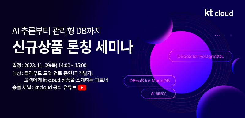 | [kt cloud 신규 상품 웨비나] DBaaS for My SQL 8 & 서버리스 (1) | 2022.12.13 |