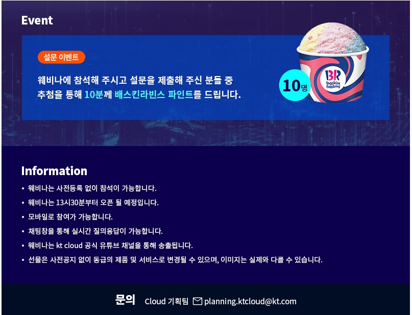 kt cloud(http://www.ktcloud.com, 대표이사 윤동식)는 클라우드 시장 흐름, 대응 전략 및 신규 상품 등을 소개하는 정기 웨비나를 진행한다고 1일 밝혔다.