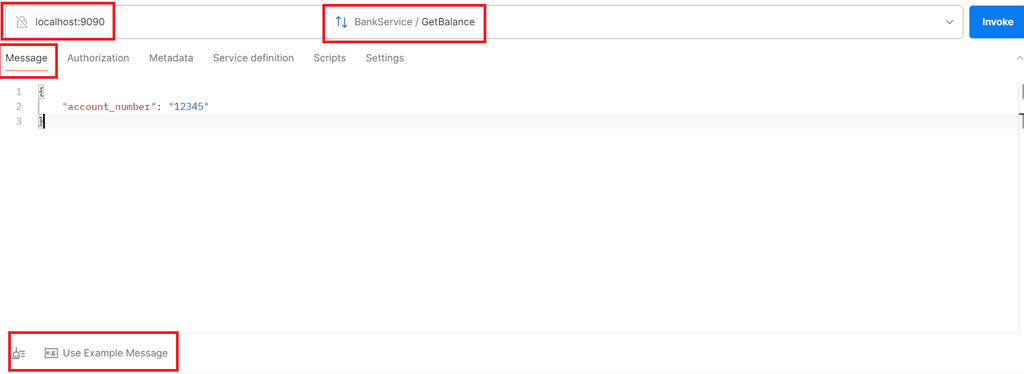 | grpcurl \  -plaintext \ -d "{\"account_number\":\"12345\"}" \ localhost:9090 \ cohttp://m.example.bank.BankService/GetBalance  |