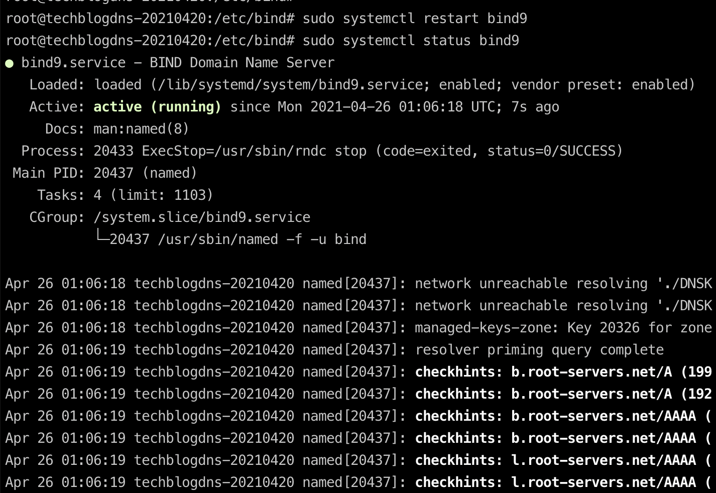 sudo systemctl restart bind9 을 통해 BIND9을 재시작해주고,