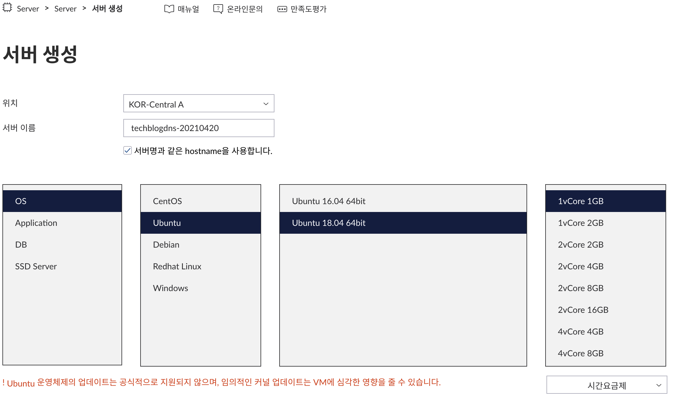 저는 KT Cloud 포탈에서 Ubuntu 18.04, 1vCore 1GB 사양의 서버를 한 대 생성했습니다.