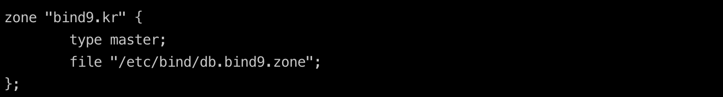 이제 우리가 목표로 하고 있는 bind9.kr 이라는 도메인에 대한 zone 파일을 설정해보도록 하겠습니다.