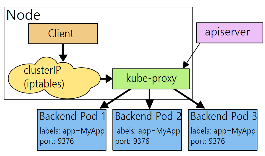 Service에 특정 이벤트가 생겼을 경우, 관련된 IP와 Port를 iptables에 업데이트 후, iptables에 의해 Pod로 트래픽을 전달