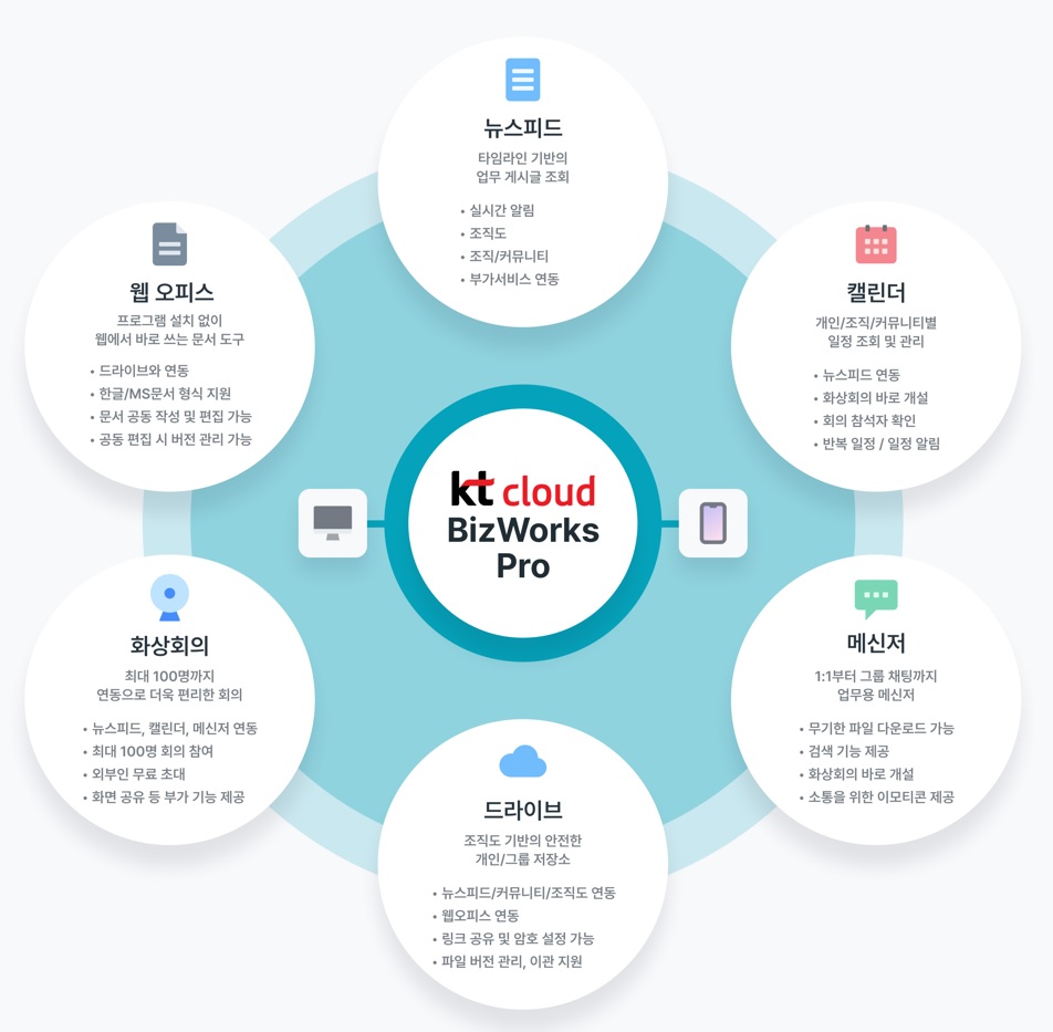 kt cloud의 대표 상품 Bizworks Pro는 공공기관에 최적화된 업무환경을 지원하는 솔루션으로 국내 50개 공공기관, 1만 2천여명이 직접 경험하고, 검증한 공공 전용 업무 협업 플랫폼이다. Public Cloud, Private Cloud, On-Premise 등 어떤 환경에서도 유연한 활용이 가능하다는 강점을 갖고 있다. Bizworks Pro는 뉴스피드, 메신저, 드라이브, 캘린더, 화상회의, 웹오피스 등의 서비스를 통해 업무 처리 간소화, 조직내 원활한 소통, 끊김 없는 연계 업무 환경 제공 등 업무 상황의 문제를 빠르게 해결한다. 또한 대면과 종이 업무를 통한 업무 환경을 종이 없이 일하는 문화 정착에 기여하고 있다. (연 76,800장 절감)