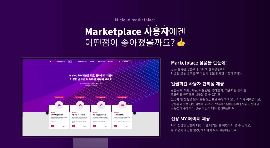 이 외에도 사용자 친화적으로 UI/UX가 확 바뀐 ‘kt cloud Marketplace’의 장점들은 아래그림을 통해서 확인 하실 수 있습니다.