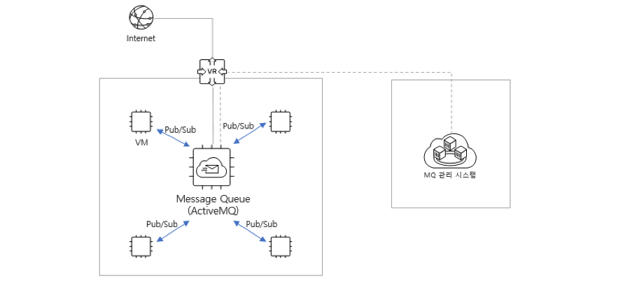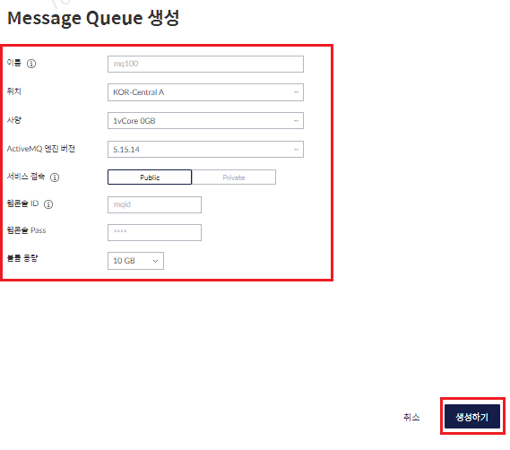 간단한 설정 작업 후 '생성하기' 버튼을 클릭하면, 아래와 같은 구조로 활용할 수 있는 Message Queue 인스턴스가 자동 배포되게 됩니다.