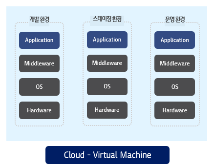 VM은 서비스의 버전별 배포를 할 때 VM별로 운영체제 (OS) 구성을 따로 하여