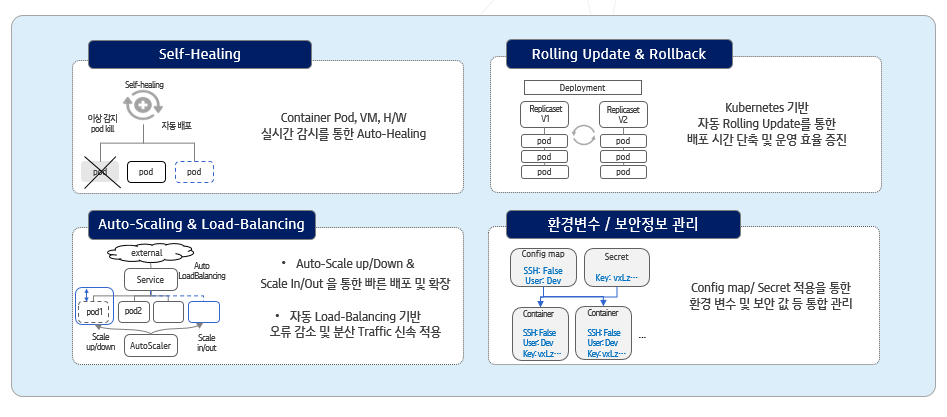 전체 컨테이너 자동 관리, 장애 발생 시 자동 처리가 가능하며,