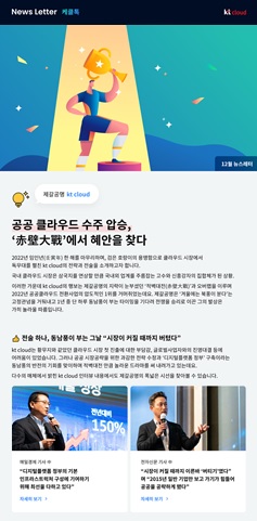 | [뉴스레터]갓생 kt cloud, 2023년 대운을 맞이하는 자세(AI, DRaaS, 영광의 그랑프리 '공공수주')_'23년 1월 호 (0) | 2023.02.14 |
