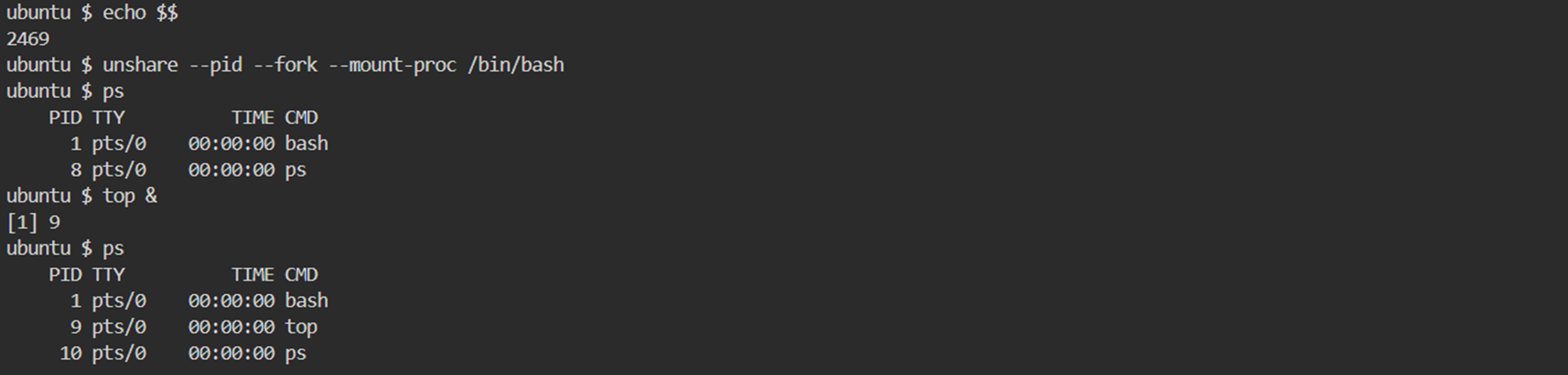 - unshare --pid --fork --mount-proc /bin/bash 를 통해 PID Namespace 를 격리 및 /bin/bash 를 실행 합니다.
