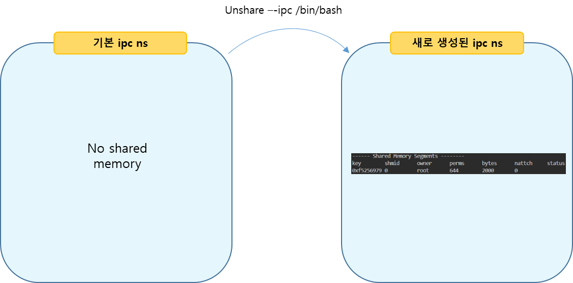 - unshare --ipc /bin/bash 를 실행하면 unshare() System Call 을 호출한 Process (/bin/bash) 는 새로 생성된 IPC Namespace 에 속하게 됩니다.