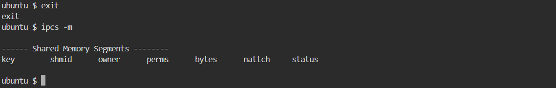 - 이전에 test 와 동일하게 ipcs -m 명령어로 Shared Memory 가 존재하는지 check 합니다.