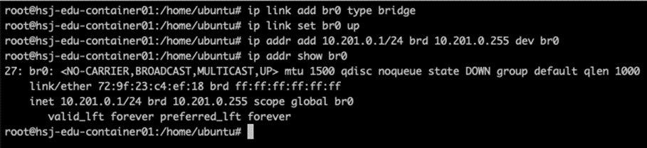 - 생성된 brigde 에 10.201.0.1/24 IP를 할당하고 10.201.0.255 를 Broadcast IP 로 지정합니다.