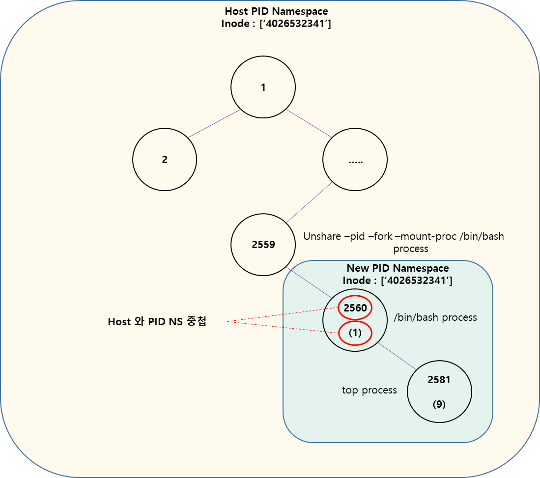 - unshare --pid --fork --mount-proc /bin/bash 를 실행하면 unshare() System Call 을 호출한 Process (/bin/bash) 는 Host PID Namespace 와 새로 생성된 PID Namespace 에 속하게 됩니다.
