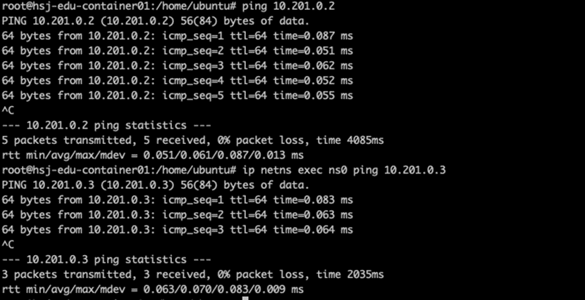 - 가상 Bridge Device 와 두 개의 Network Namespace 를 생성해 주었고 각각 IP 10.201.0.2~3 을 할당 했습니다.