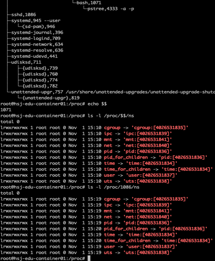 - /proc/1071/ns 와 /proc/1086/ns 의 비교에서 모든 Type 의 Symbolic Link 가 동일한 Inode Number 를 보유합니다면, 두 Process 는 모든 Type 의 Host Namespace 들 에 속해 있습니다는 것을 의미 합니다.