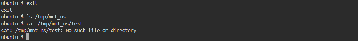 - 이전에 test 와 동일하게 /tmp/mnt_ns 상의 test file 이 존재하는 check 합니다.