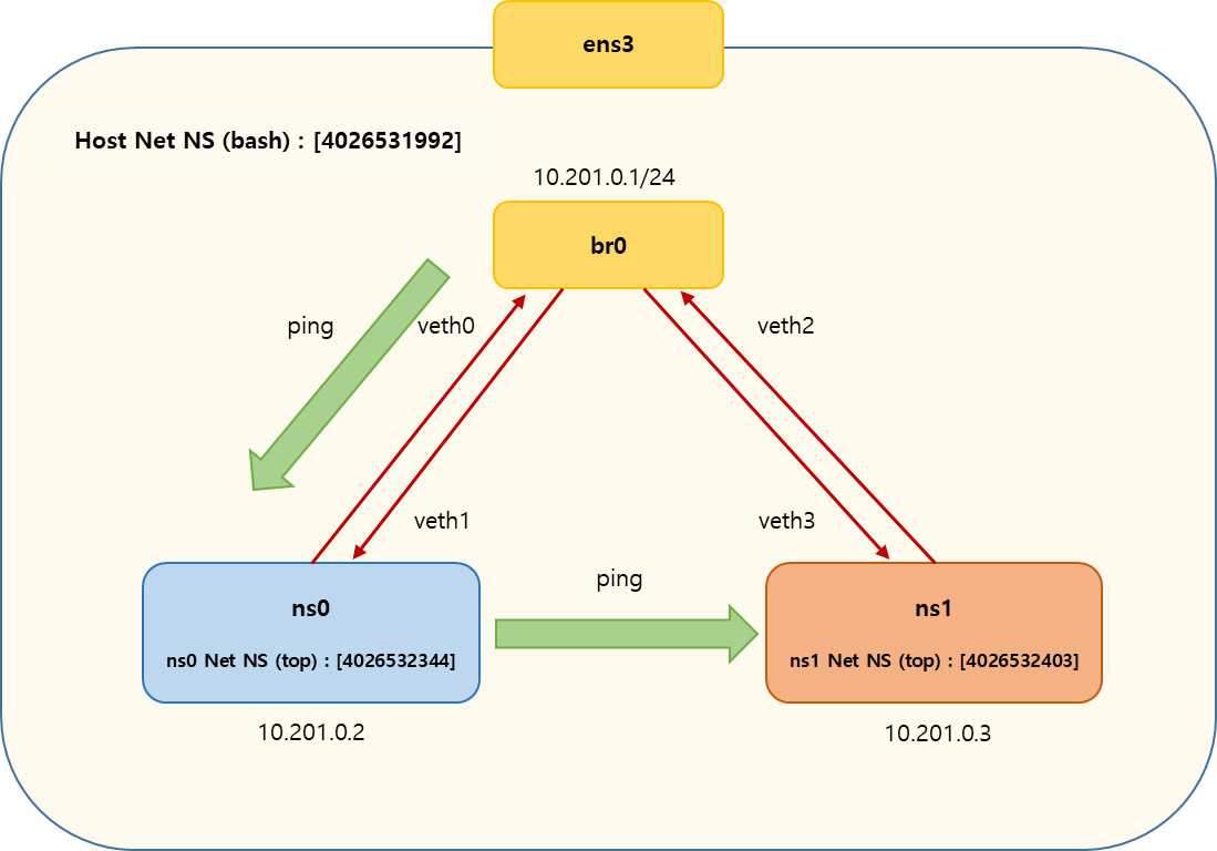- veth0, veth2 의 Link 를 bridge br0 에 연결하고 veth1, veth3 은 각각 ns0, ns1 에 연결합니다.