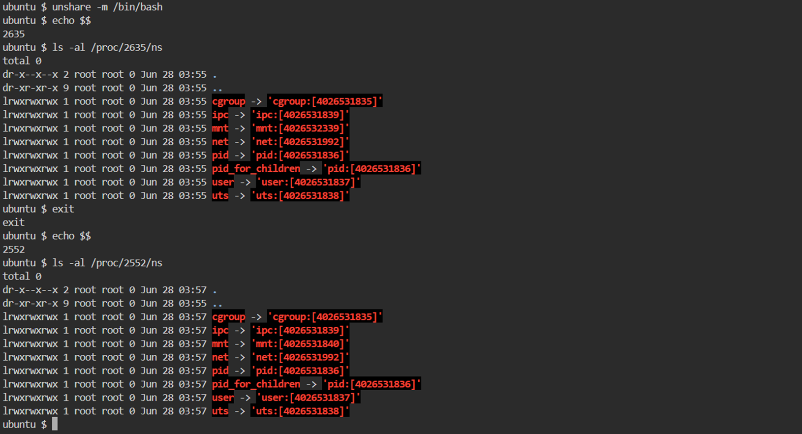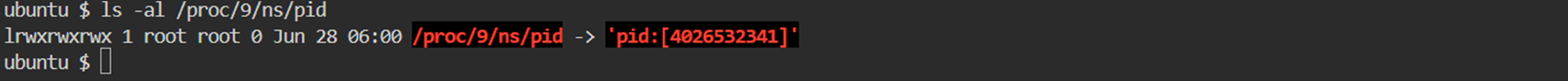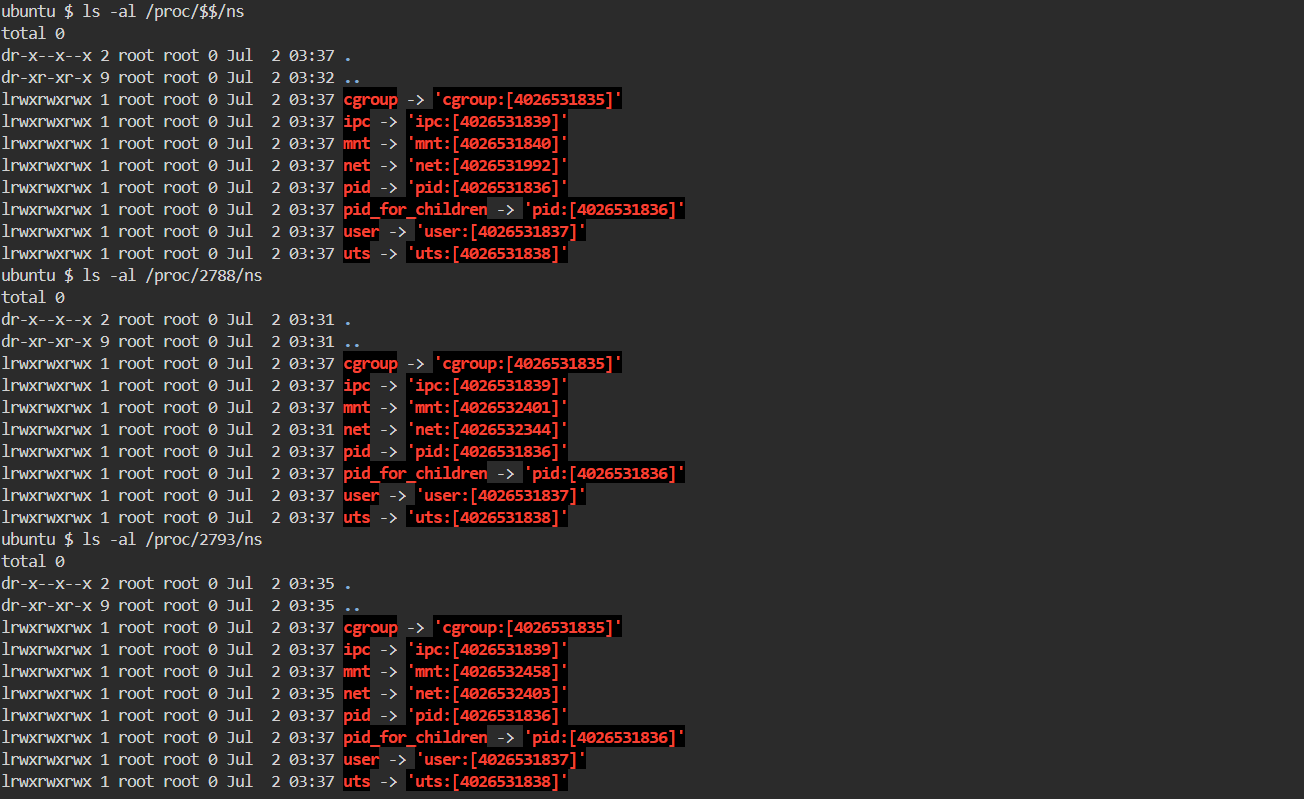 - /proc/1071/ns 와 /proc/1086/ns 의 비교에서 모든 Type 의 Symbolic Link 가 동일한 Inode Number 를 보유합니다면, 두 Process 는 모든 Type 의 Host Namespace 들 에 속해 있습니다는 것을 의미 합니다.