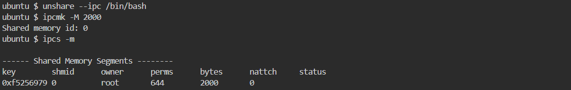 - unshare 명령어를 사용해서 새로운 IPC Namespace 를 생성 후 bash program 을 실행시킨다.