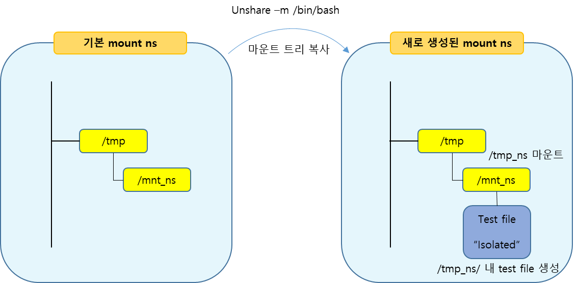 - unshare -m /bin/bash 를 실행하면 unshare() System Call 을 호출한 Process (/bin/bash) 는 기본 Mount Namespace 상의 Mount-Tree 의 사본을 가져옵니다.