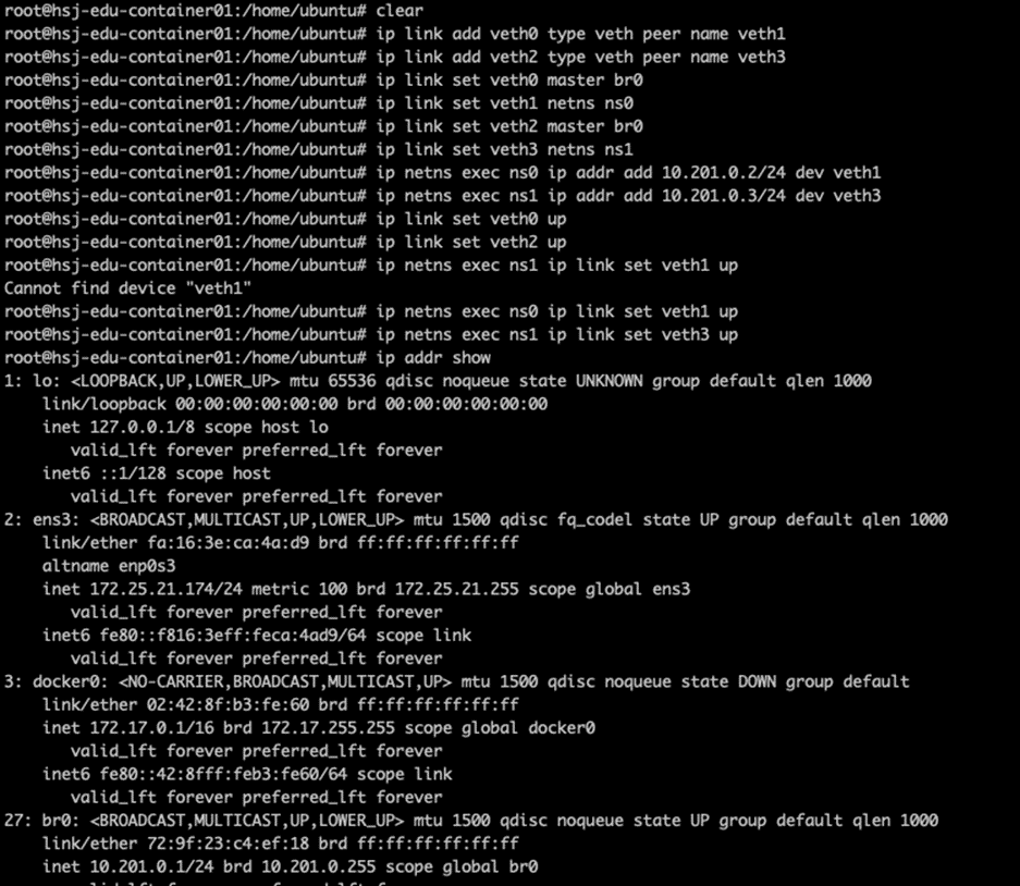 - Host - New NS 의 연결 시 Host 상에서는 veth0, veth2 만 노출되며, veth1, veth3 은 각각의 Namespace (ns0, ns1) 내에서만 노출 됩니다.