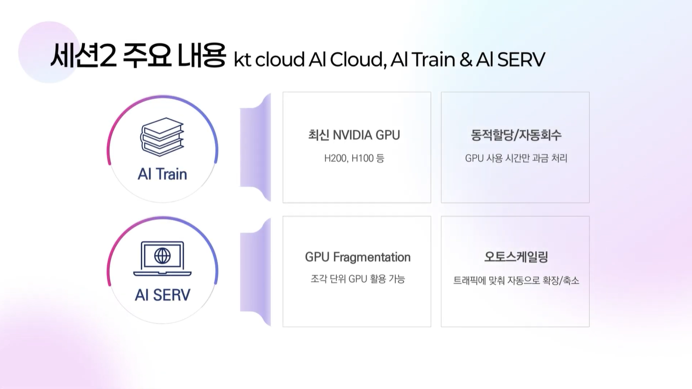 이런 진입장벽을 해결하기 위해 kt cloud는 엔비디아 H200을 비롯한 최신 GPU 인프라에 지속적으로 투자하고 있습니다. 사용자는 실제 사용한 GPU 시간만큼 비용을 지불하는 유연한 과금 모델을 통해 초기 투자 부담을 줄일 수 있습니다. 또한 다양한 AI 프레임워크 및 과학 연산 환경을 지원하며, AI 모델의 개발-배포-운영을을 자동화를 지원하는 AI Ops 서비스도 새롭게 선보일 예정입니다.
