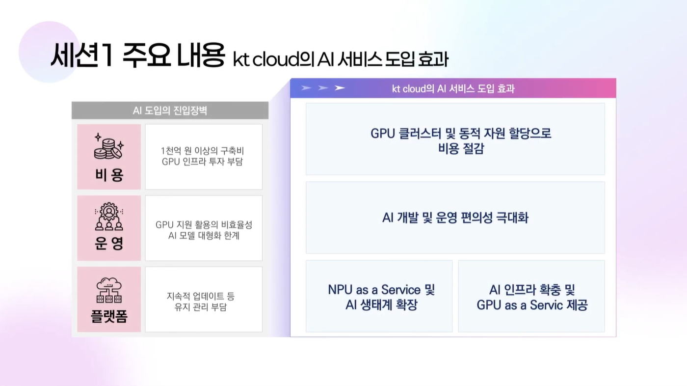kt cloud는 AI 학습부터 추론까지 AI 서비스 개발에 필요한 모든 인프라를 지원하며 GPU 뿐만 아니라 NPU와 같이 최신 AI 하드웨어도 제공하여 고객의 선택 폭을 넓히고 있습니다. 앞으로도 다양한 AI 워크로드를 지원하는 클라우드 환경을 지속적으로 발전시켜 나갈 계획입니다.