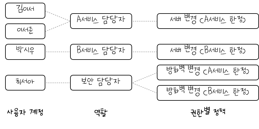 사용자를 역할에 맵핑하고 각 역할별로 권한을 제한하여, 갑작스러운 퇴사 등 인력의 변동에 빠르게 대비할 수 있습니다. 이러한 방식의 접근제어를 Role-based Access Control이라 하며, 이는 IAM을 활용해 일반적으로 권한을 제어하는 방식입니다.
