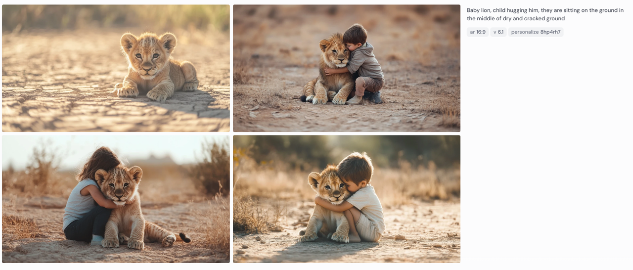 | baby lion, child hugging him, they are sitting on the ground in the middle of dry and cracked ground --ar 16:9 |