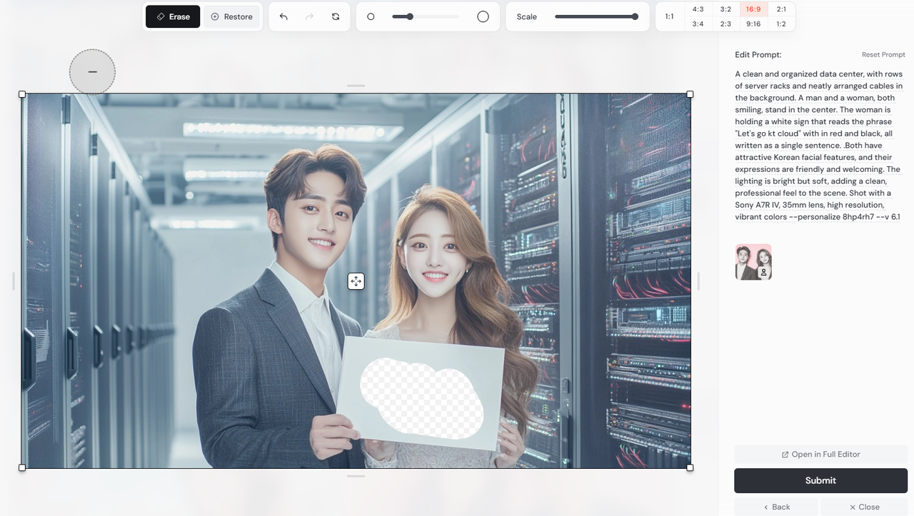 깔끔한 데이터 센터를 배경으로 랙과 케이블이 보이도록 설정합니다. 그리고 중앙에 남녀 한쌍이 미소지으며 서있도록 요청합니다. 아까 입력했던 것과 같이 kt cloud를 넣도록하며 이때 Let’s go kt cloud 문구가 써있는 팻말을 들고 있도록 요구 사항을 추가했습니다.