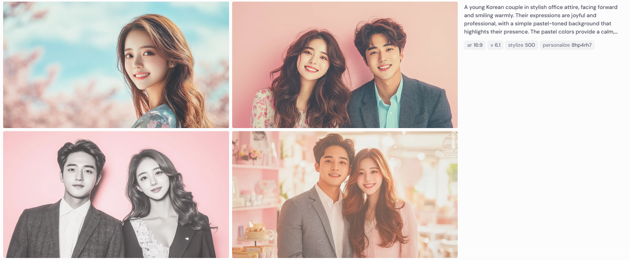 커플을 그리지 못한 첫 번째 결과물을 제외하고는 웃는 모습이 예쁜 동양인 커플의 모습이 생성됐습니다.