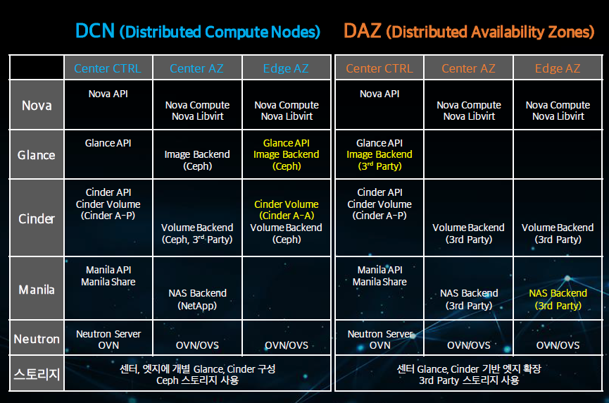 'OpenStack DCN (Distributed Compute Nodes)'와 'a.k.a DAZ (Distributed Availability Zones)' 비교_ 출처 : kt cloud