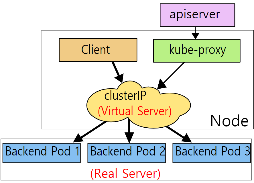 Service에 특정 이벤트가 생겼을 경우, 관련된 IP와 Port를 iptables에 업데이트 후, iptables에 의해 Pod로 트래픽을 전달