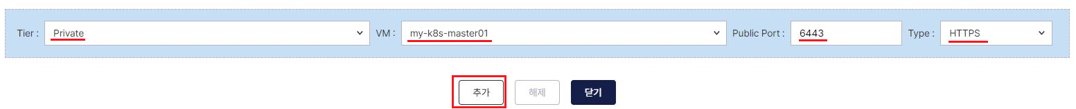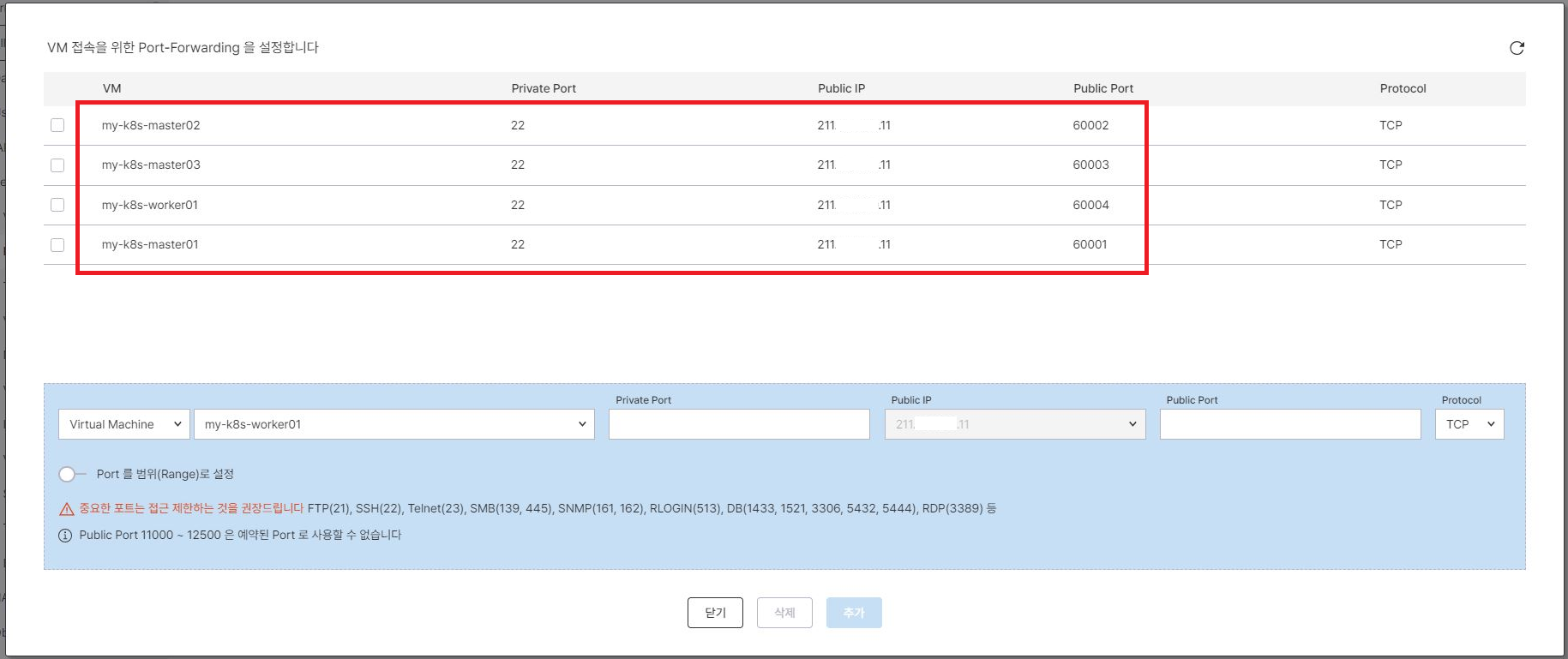 화면과 같이 대상 Virtual Machine 선택 ‘my-k8s-master01’, Private Port 는 ‘22’, Public Port는 ‘60001’ 로 입력 후 “추가” 해주세요.
