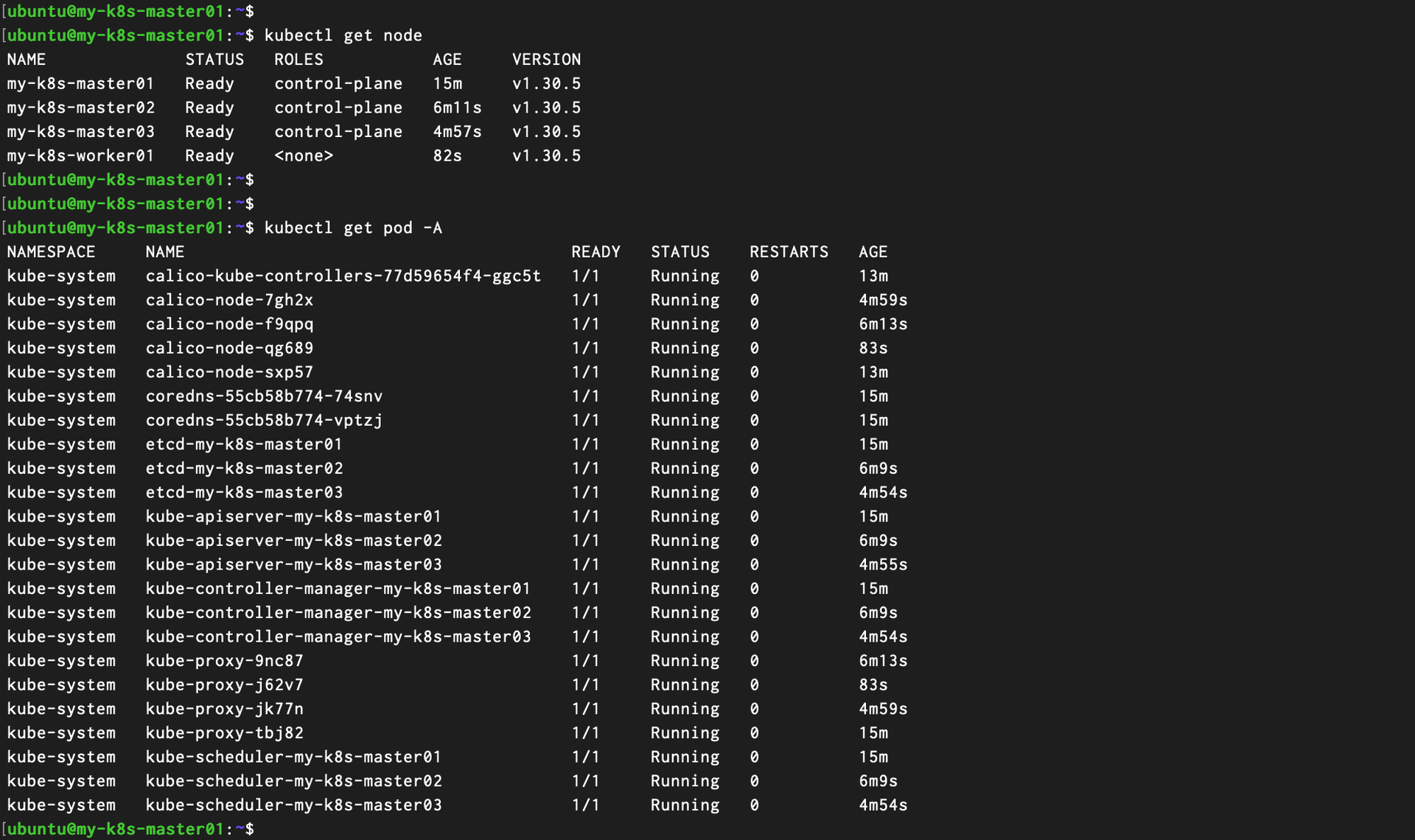 그럼 다시 ‘my-k8s-master01’ 서버로 돌아가서 kubectl 명령어로 ‘my-k8s-master02’와 ‘my-k8s-master03’서버가 정상적으로 조회 되는지 확인 해볼까요?