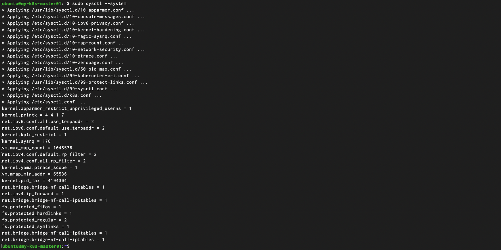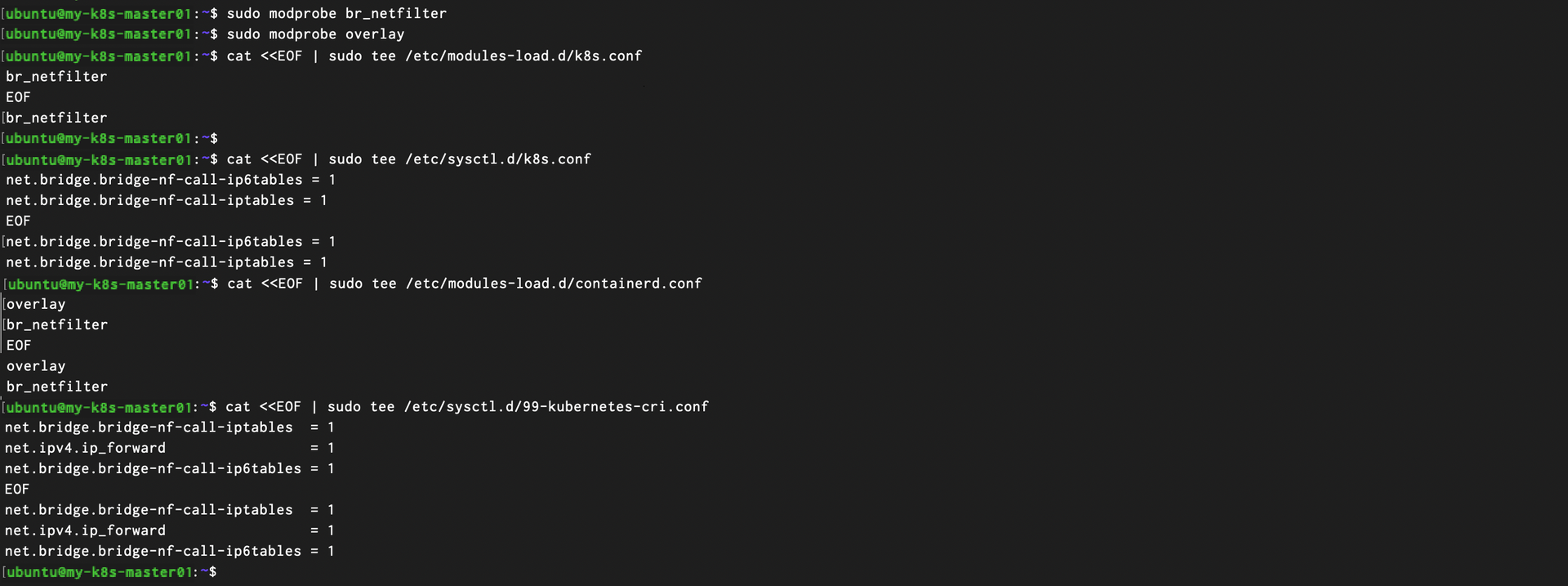 | $ sudo modprobe br_netfilter $ sudo modprobe overlay $ cat <<EOF | sudo tee /etc/modules-load.d/k8s.conf br_netfilter EOF $ cat <<EOF | sudo tee /etc/sysctl.d/k8s.conf net.bridge.bridge-nf-call-ip6tables = 1 net.bridge.bridge-nf-call-iptables = 1 EOF $ cat <<EOF | sudo tee /etc/modules-load.d/containerd.conf overlay br_netfilter EOF $ cat <<EOF | sudo tee /etc/sysctl.d/99-kubernetes-cri.conf net.bridge.bridge-nf-call-iptables = 1 net.ipv4.ip_forward = 1 net.bridge.bridge-nf-call-ip6tables = 1 EOF $ sudo sysctl --system |