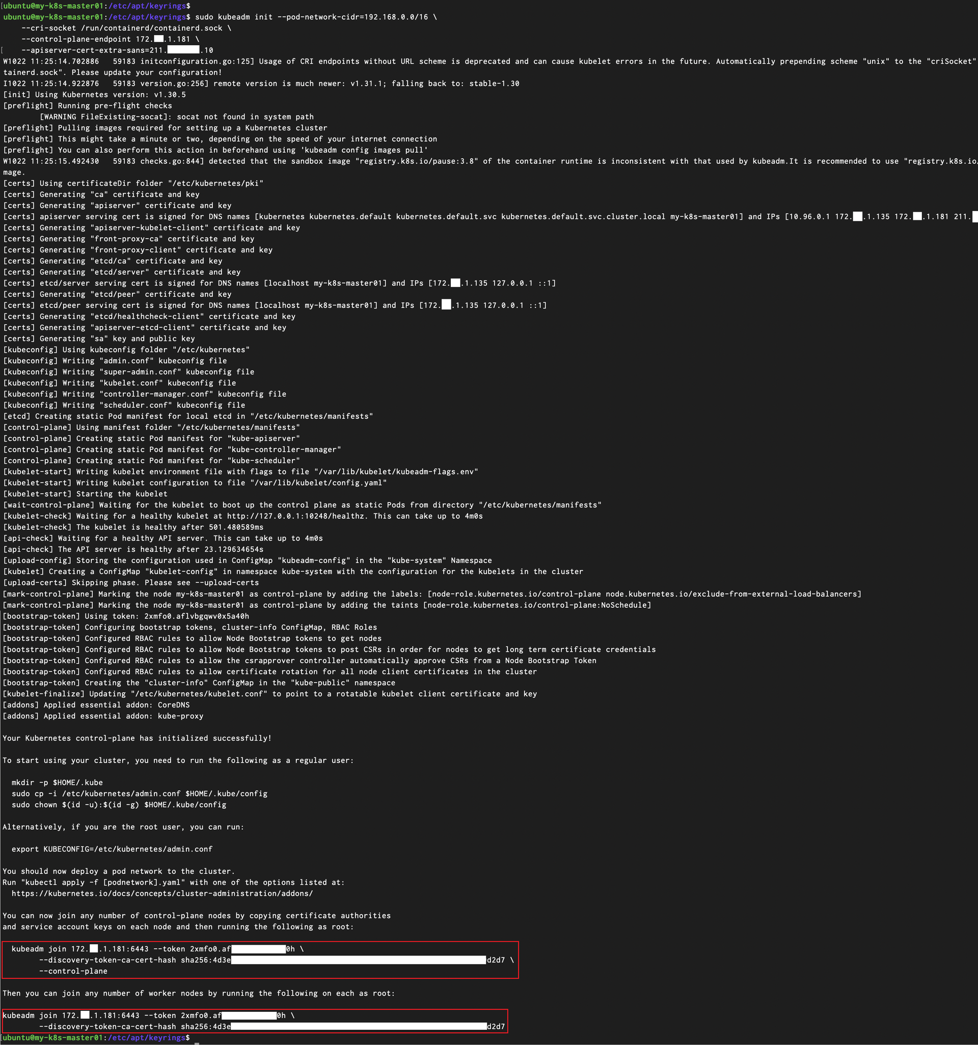 $ sudo kubeadm init --pod-network-cidr=192.168.0.0/16 \ --cri-socket /run/containerd/containerd.sock \ --control-plane-endpoint 172._.1.181 \ --apiserver-cert-extra-sans=211._._.10 |
