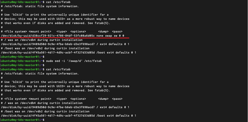 | #swap Memory 확인 $ free -m #swap memory off $ sudo swapoff -a #VM 재부팅 시 설정 초기화 방지를 위한 fstab 수정 $ sudo sed -i '/swap/d' /etc/fstab |