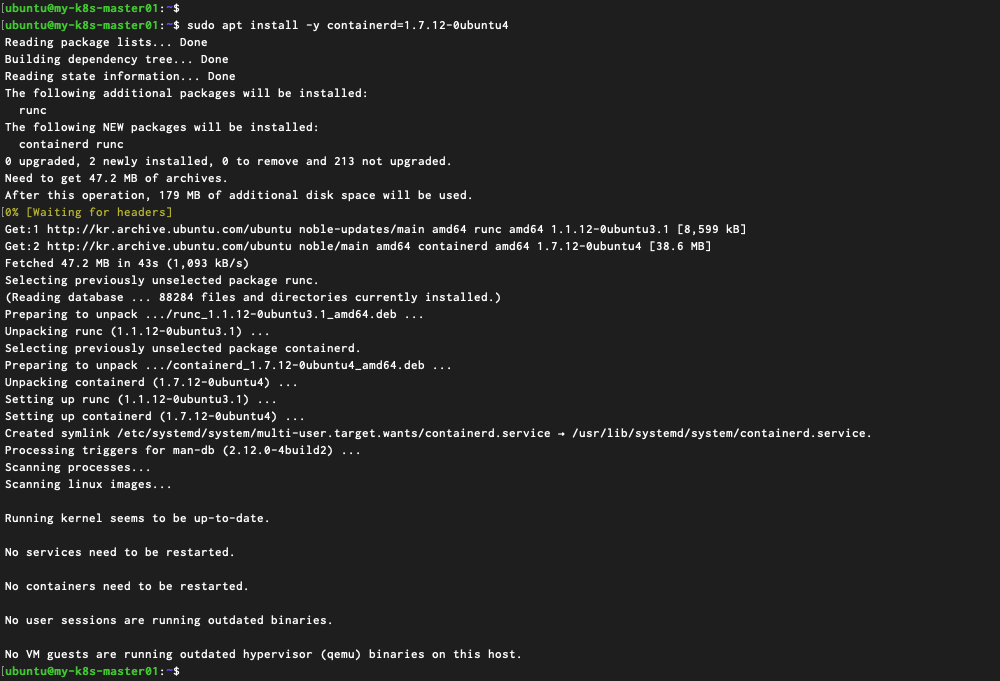 | #containerd 설치 - 1.7.12 버전 특정 $ sudo apt install -y containerd=1.7.12-0ubuntu4 #containerd 상태 확인 $ systemctl stauts containerd # containerd enable $ sudo systemctl enable containerd |