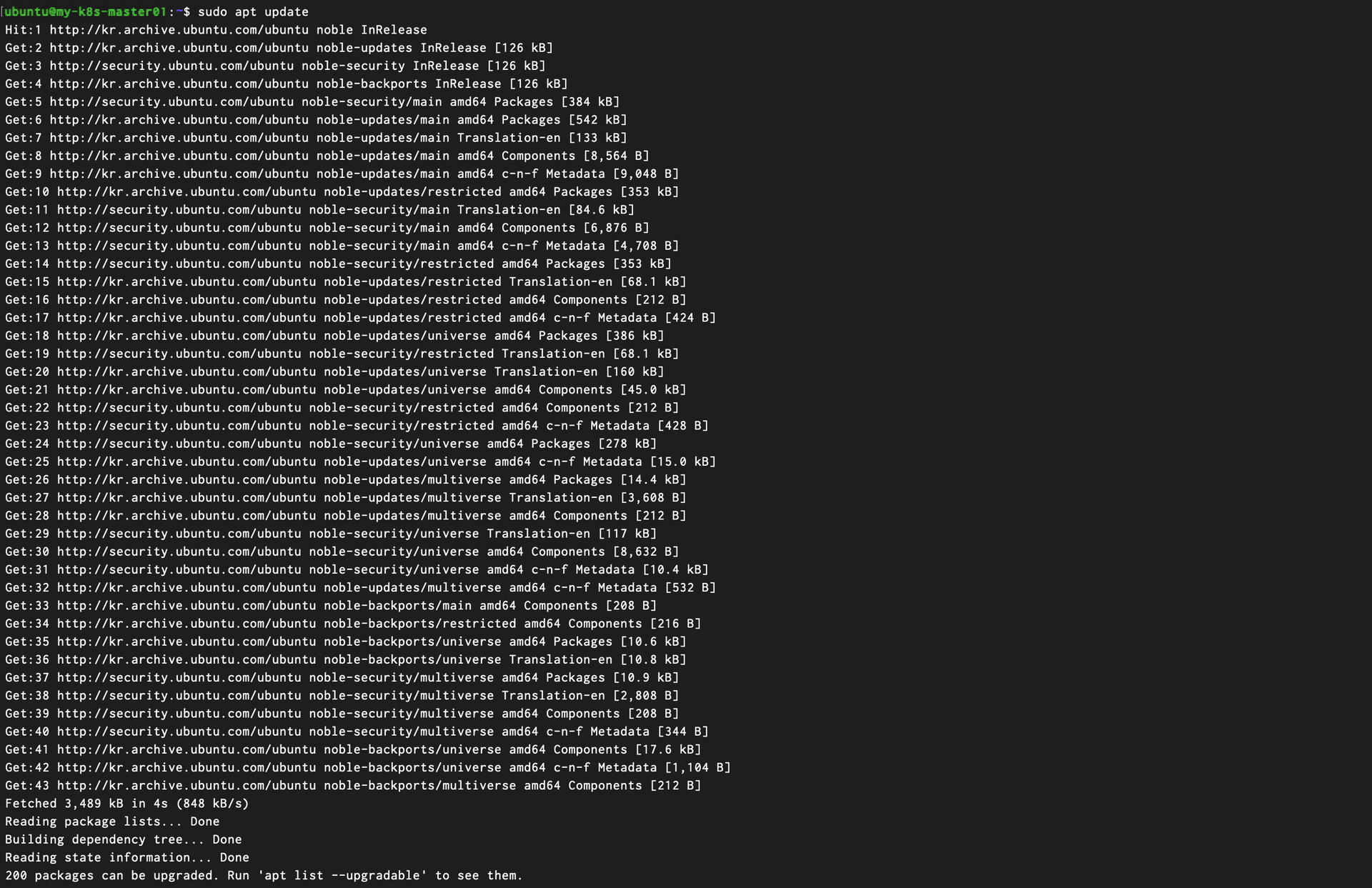 # kuberentes apt keyrings 받아오기 $ sudo curl -fsSL https://pkgs.k8s.io/core:/stable:/v1.30/deb/Release.key | sudo gpg --dearmor -o /etc/apt/keyrings/kubernetes-apt-keyring.gpg # kubernetes 패키지 repo 정보 추가 $ echo 'deb [signed-by=/etc/apt/keyrings/kubernetes-apt-keyring.gpg] https://pkgs.k8s.io/core:/stable:/v1.30/deb/ /' | sudo tee /etc/apt/sources.list.d/kubernetes.list # apt repo upddate $ sudo apt-get update |