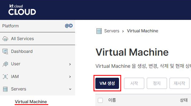kt cloud Console에 접속하신 후 아래와 같이 VM 을 생성해주세요.