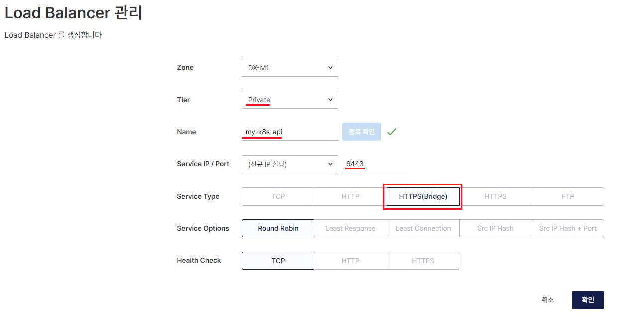 때문에 3대의 Master 노드의 단일 진입점이 필요한데요, 이를 위해 먼저 LB(Load Balancer)를 생성하고 각 Master 노드로 바인딩 하겠습니다.