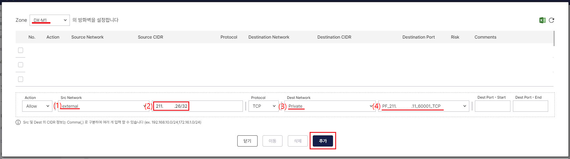 - (4) Dest CIDR : ‘PF_211.X.X.11_60001_TCP’ 선택