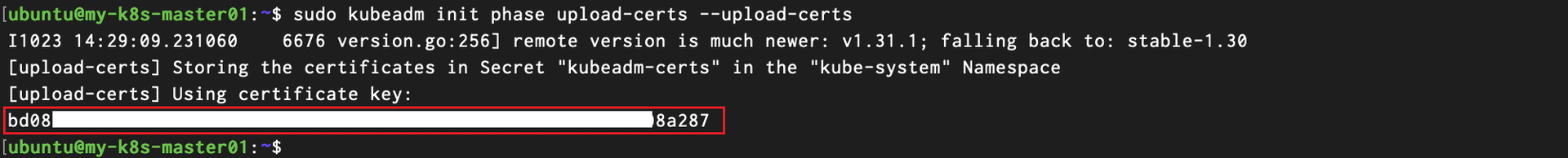 | $ sudo kubeadm init phase upload-certs --upload-certs |
