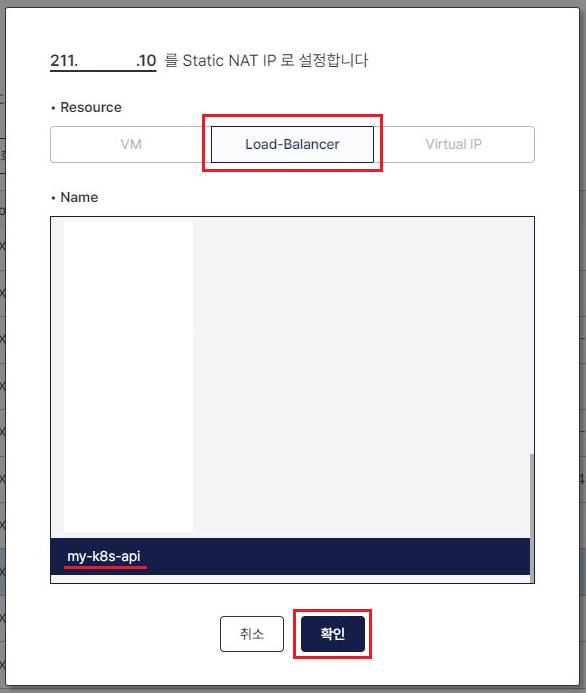 아래와 같이 팝업 화면이 나오면 ‘Load Balancer’ 탭으로 가서 위에서 생성했던 LB를 선택 후 '확인' 버튼을 클릭 해주세요.
