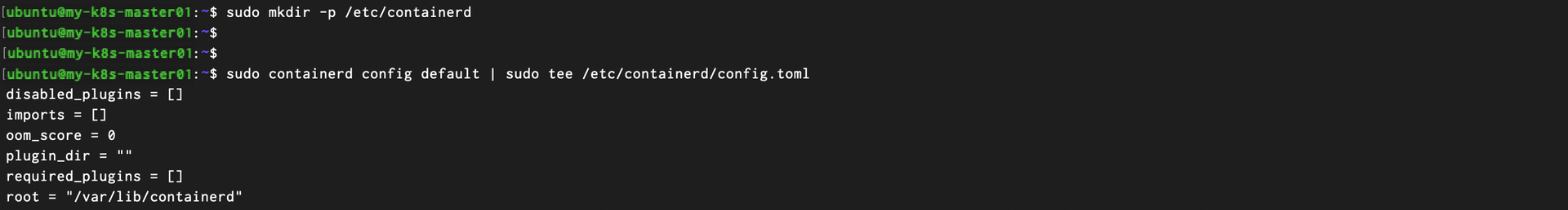 # containerd 디렉토리 생성 $ sudo mkdir -p /etc/containerd # containerd defalt Config 기반으로 config.toml 생성 $ sudo containerd config default | sudo tee /etc/containerd/config.toml # 파일 권한 수정 $ sudo chmod 644 /etc/containerd/config.toml # Cgroup 설정 변경 $ sudo sed -i 's/SystemdCgroup = false/SystemdCgroup = true/g' /etc/containerd/config.toml # containerd 재기동 및 상태 확인 $ sudo systemctl restart containerd $ systemctl status containerd |