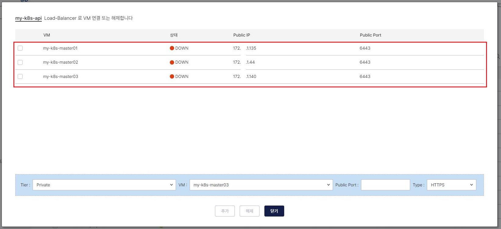 팝업창이 나오면 아래와 같이 ‘my-k8s-master01~03'에 대하여 동일하게 “추가” 해주세요