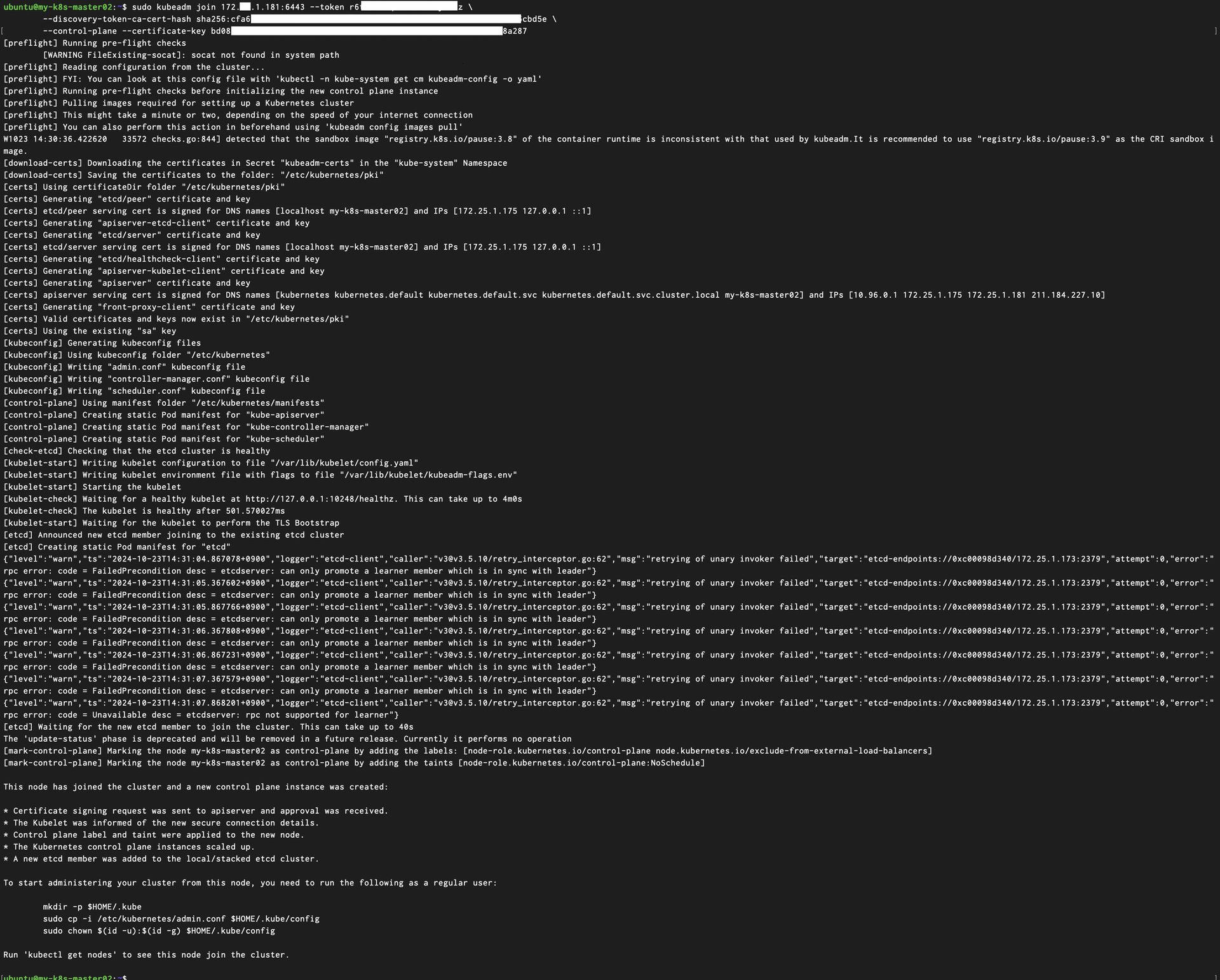 | $ sudo kubeadm join 172.X.1.181:6443 --token 2xmfo0.af__________0h \ --discovry-token-ca-cert-hash sha256:4d32____________________________d2d7 \ --control-plane --certificate-key eb3de______________________________________61db |